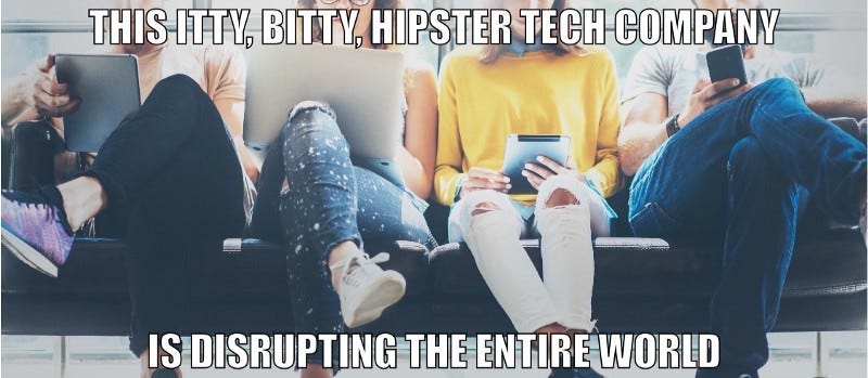My personal favorite is the “tiny disruptors.” These ads feature a picture of a group of diverse twenty-somethings wearing t-shirts and smirking outside a building. The text reads something along the lines of: “This tiny [local name of town] company is disrupting the billion-dollar [insurance/banking/investing/asset management] industry.” Yes, folks, insurance is expensive, but two guys and a dog are leveraging technology to INVENT a new type of insurance that makes the industry giants quake in their boots. Think of this ad as the “Uber,” but for [insert industry here]. These jokers appear everywhere, sometimes three or four times within a single news article.