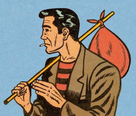 I was yapping over cocktails with my friend, Carl, this past summer. Somehow the conversation turned to my nephews’ fascination with hobos. I’m not talking about the problem of the homeless, I am talking about 1930s depression-era hobo attire complete with the handkerchief and and stick knapsack. My nephews (ages 12 and 14) consider themselves to be hipsters.